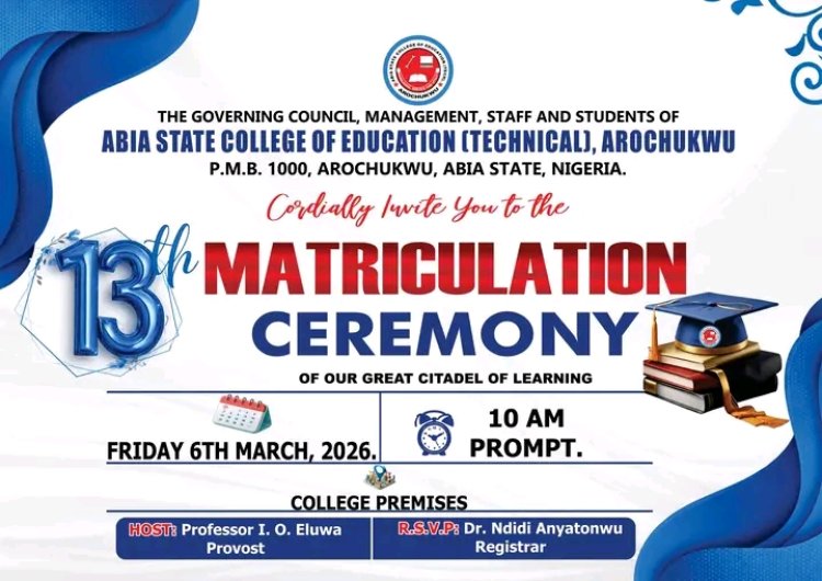 The Governing Council, Management, Staff, and Students of Abia State College of Education (Technical), Arochukwu proudly announce the 13th Matriculation Ceremony for newly admitted students.
