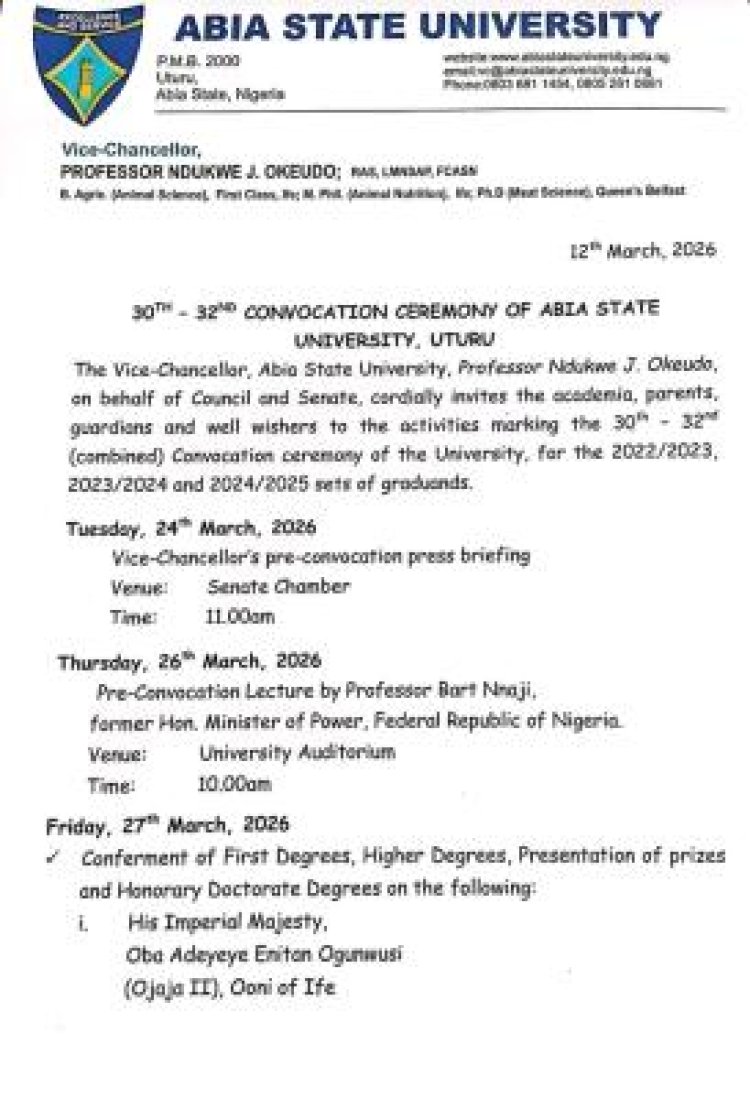 The Vice-Chancellor of Abia State University (ABSU), Professor Ndukwe J. Okeudo, on behalf of Council and Senate, invites academics, parents, guardians, and well-wishers to the combined 30th, 31st, and 32nd Convocation ceremonies for the 2022/2023, 2023/2024, and 2024/2025 graduating sets