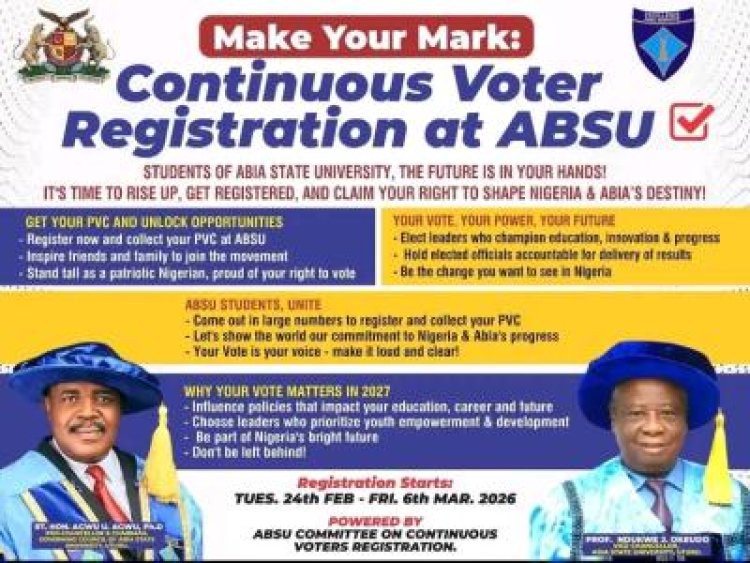 Students of Abia State University (ABSU) are being urged to actively participate in the ongoing Continuous Voter Registration (CVR) exercise, aimed at boosting youth engagement ahead of the 2027 elections.