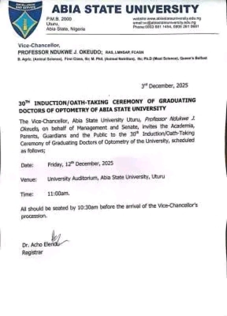 Abia State University (ABSU), Uturu, has announced Friday, December 12, 2025, as the date for its 30th Induction and Oath-Taking Ceremony for graduating Doctors of Optometry.