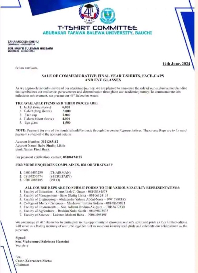 The T-Shirt Committee of Abubakar Tafawa Balewa University (ATBU), Bauchi, has announced the sale of commemorative final year t-shirts, face caps, and eye glasses.