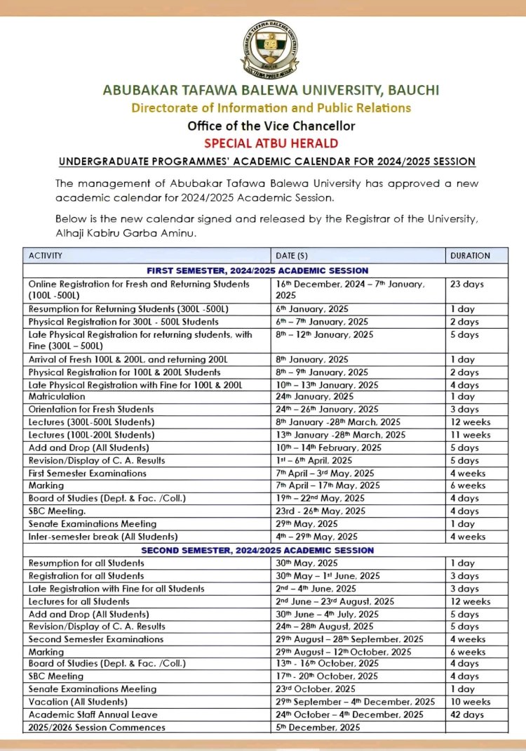 Abubakar Tafawa Balewa University (ATBU), Bauchi, has announced its academic calendar for the 2024/2025 session. The university's management has approved the calendar, outlining key dates for undergraduate programs.