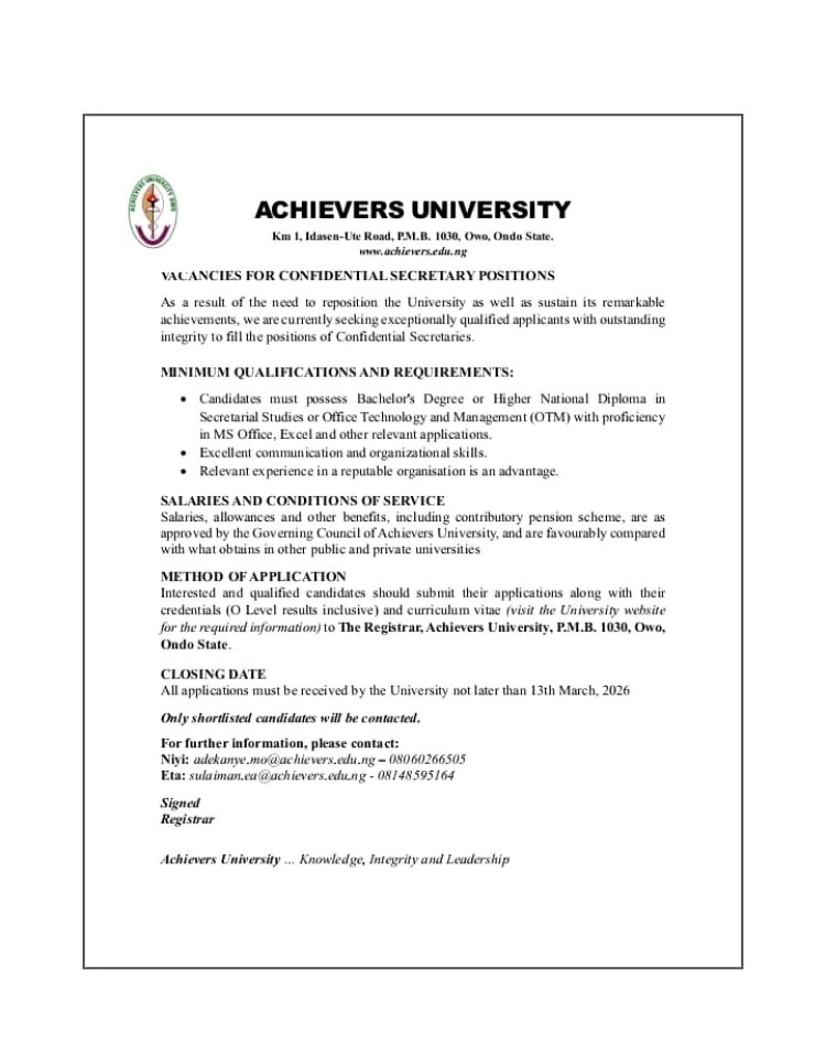 In a strategic move to strengthen its administrative framework and sustain its record of excellence, Achievers University, Owo, has opened applications for the position of Confidential Secretary.