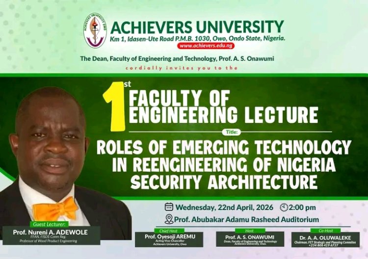 Achievers University, Owo, has announced its 1st Faculty of Engineering Lecture, scheduled to bring together academics, professionals, and members of the public for a strategic discussion on technology-driven security reform in Nigeria.