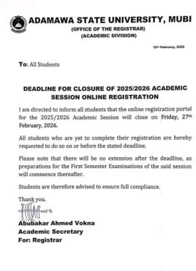 The Adewale State University (ADSU) management has informed all students that the online registration portal for the 2025/2026 academic session will close on Friday, 27th February 2026.