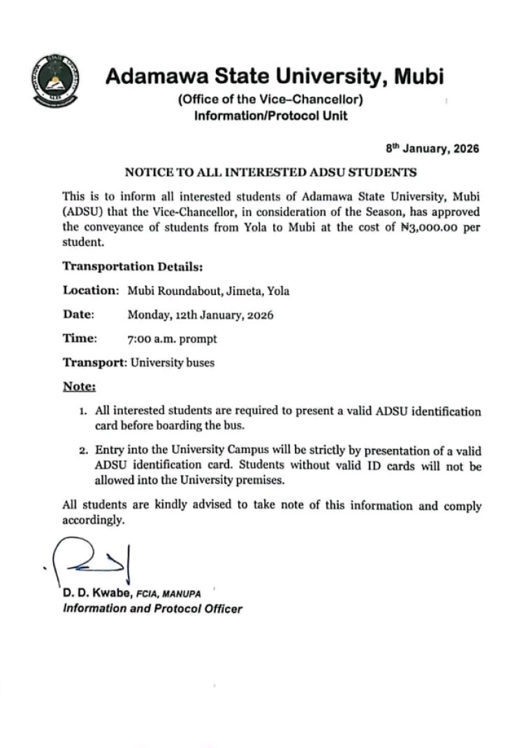 Adamawa State University, Mubi (ADSU) has approved special transportation arrangements to convey interested students from Yola to Mubi ahead of the resumption of academic activities.