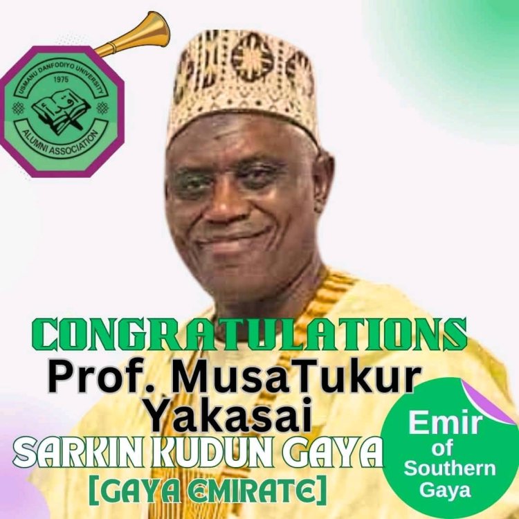 Professor Musa Tukur Yakasai, Vice Chancellor of Aliko Dangote University of Science and Technology, Wudil - Kano State, and Chairman of the Kano State Chapter of UDUS Alumni Association, has been appointed as Sarkin Kudun Gaya by the Gaya Emirate Council.