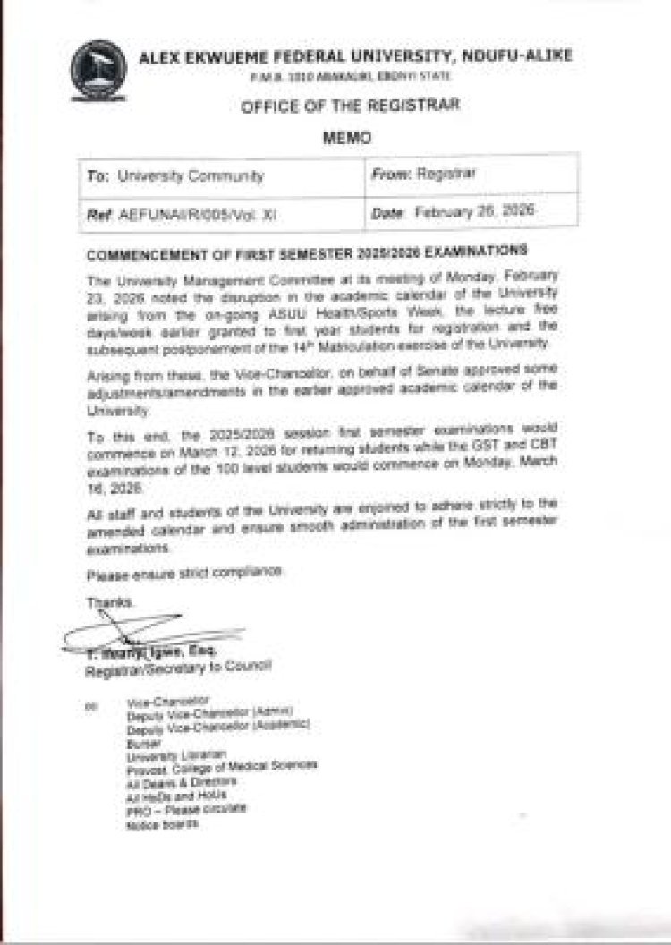 The management of Alex Ekwueme Federal University, Ndufu-Alike (AE-FUNAI) has announced a revised schedule for the commencement of the 2025/2026 first semester examinations.