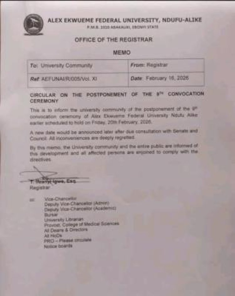 The Alex Ekwueme Federal University Ndufu-Alike management has announced the postponement of its 9th Convocation Ceremony, which was originally scheduled for Friday, 20th February 2026.