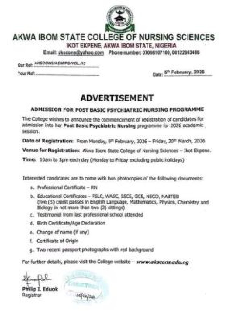 The Akwa Ibom State College of Nursing Sciences (AKSCONS), Ikot Ekpene, has announced the commencement of registration for admission into its Post Basic Psychiatric Nursing Programme for the 2026 academic session.