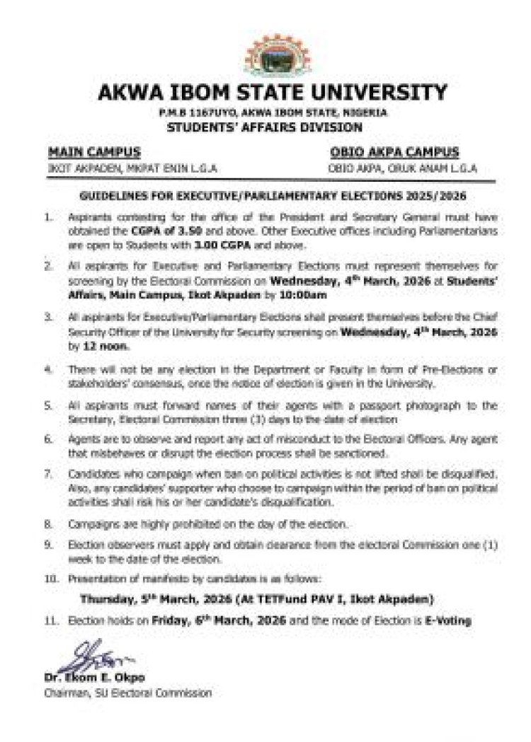 The Akwa Ibom State University (AKSU) has released official guidelines for its upcoming Executive and Parliamentary Student Union elections, scheduled for Friday, 6th March 2026.