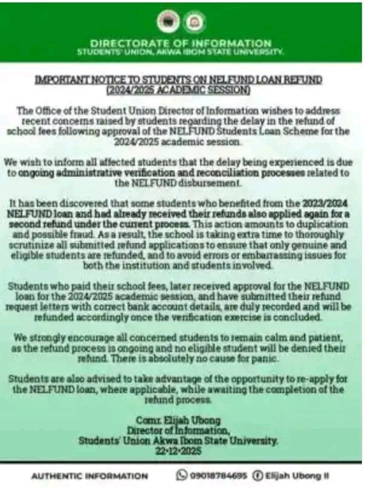 The Students’ Union of Akwa Ibom State University (AKSU), through its Directorate of Information, has clarified concerns surrounding the delay in the refund of school fees to students approved under the NELFUND Students Loan Scheme for the 2024/2025 academic session.