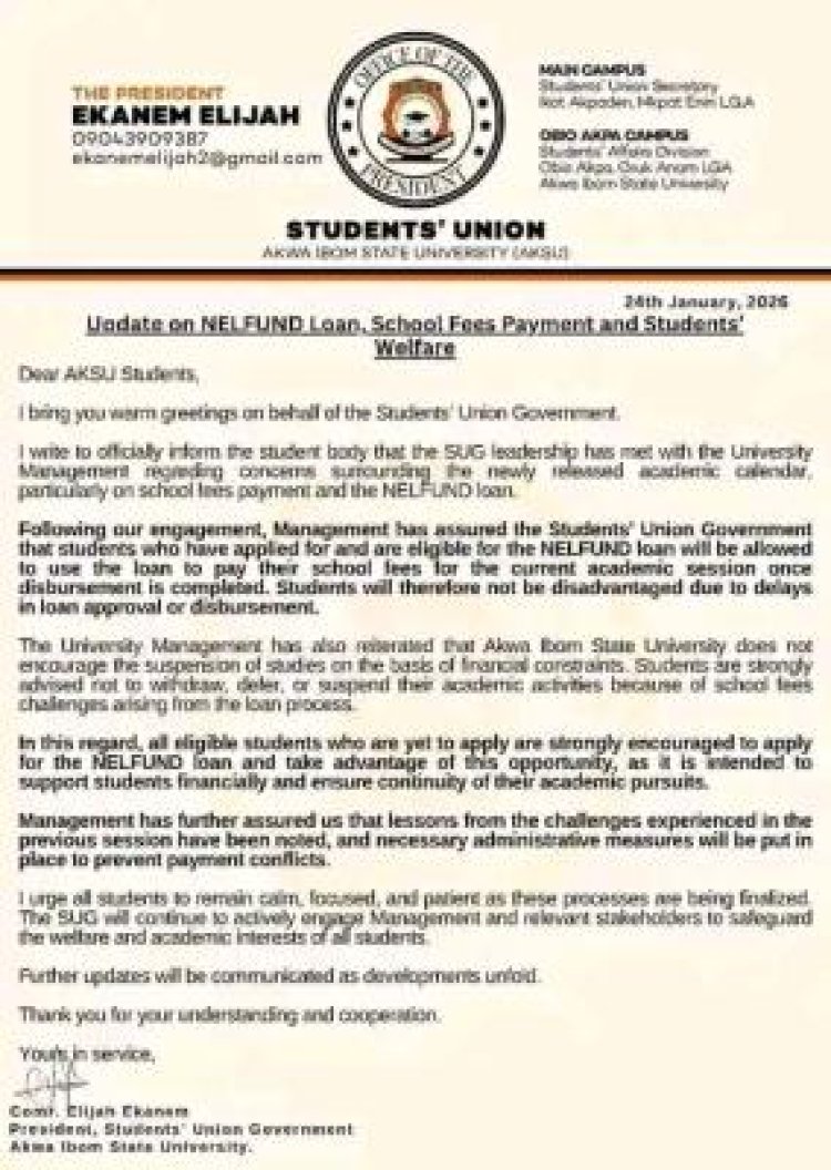 According to a statement signed by SUG President Comr. Elijah Ekanem, students who have applied for the Nigerian Education Loan Fund (NELFUND) will be safeguarded. Management has assured that eligible students will be allowed to use the loan to pay their school fees for the current session once disbursements are finalized. Importantly, no student will be disadvantaged due to technical delays in loan approval or disbursement.