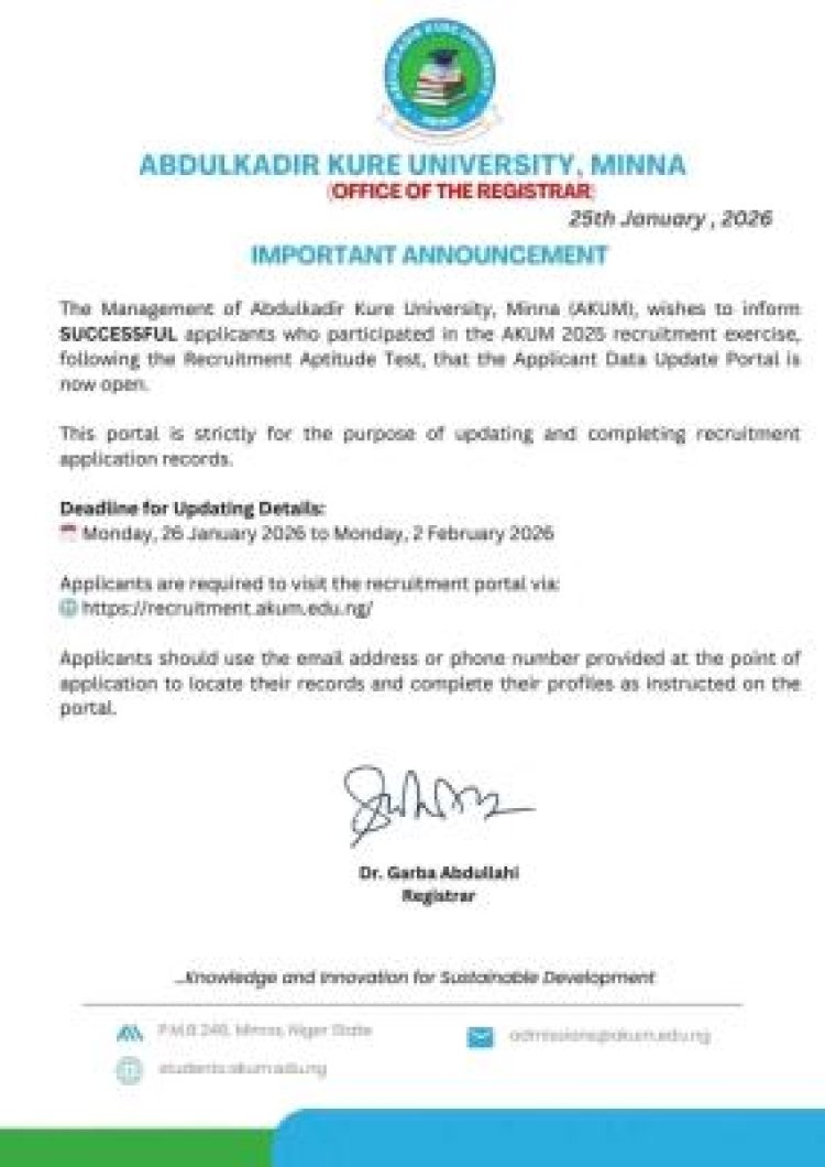 The Management of Abdulkadir Kure University, Minna (AKUM) has officially opened a dedicated online portal for candidates who were successful in the 2025 recruitment exercise.