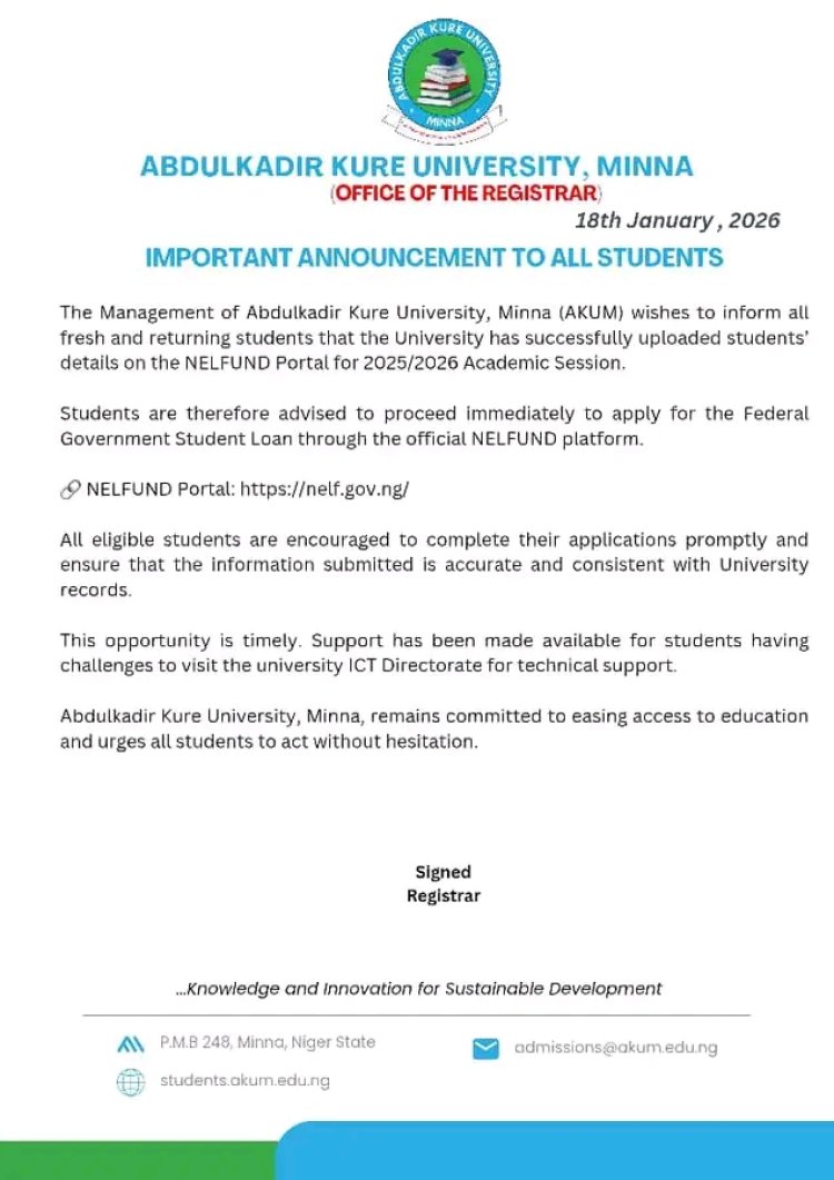 The Management of Abdulkadir Kure University (AKUM), Minna, has announced that students’ details for the 2025/2026 Academic Session have been successfully uploaded to the NELFUND Portal.