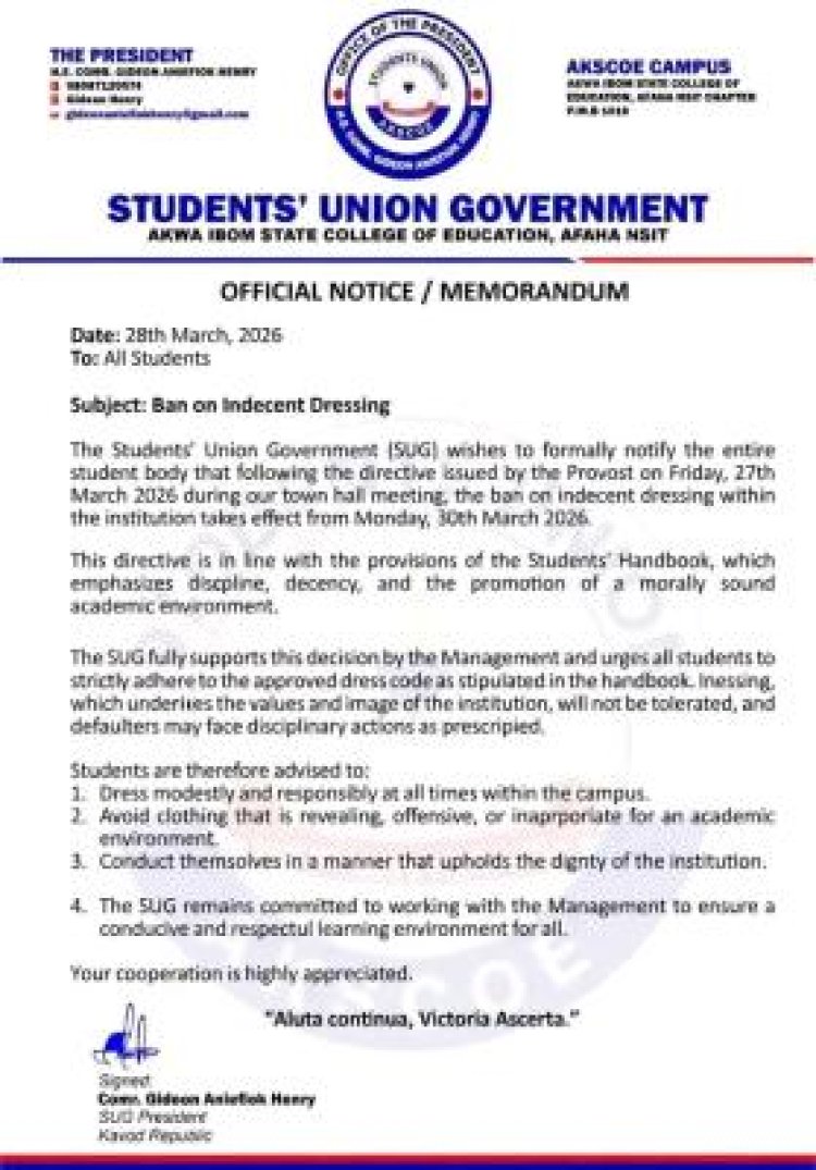 The Students’ Union Government of Akwa Ibom State College of Education has announced the commencement of a ban on indecent dressing within the institution, effective Monday, March 30, 2026.