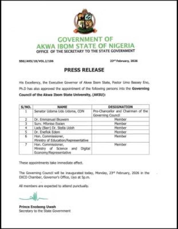 According to a press release issued on 23rd February 2026, the appointments were made by Governor Umo Bassey Eno. Leading the new council is Udoma Udo Udoma, who will serve as Pro-Chancellor and Chairman. Other appointees include Dr. Emmanuel Ekuwem, Surveyor Mfoniso Essien, Lady (Barr.) Dr. Stella Udoh, and Dr. Enefiok Edem.