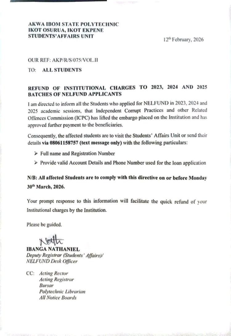 The Students’ Affairs Unit of Akwa Ibom State Polytechnic, Ikot Osurua, Ikot Ekpene, has announced the refund of institutional charges for students who applied for NELFUND in the 2023, 2024, and 2025 academic sessions.