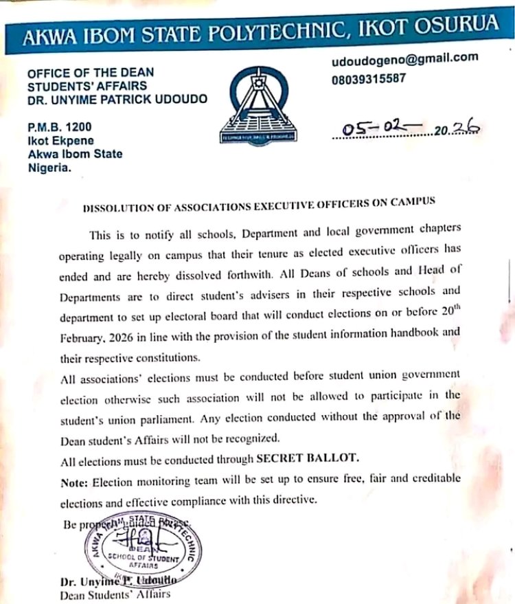 The Office of the Dean of Students’ Affairs at Akwa Ibom State Polytechnic, Ikot Osurua, Ikot Ekpene, has announced the dissolution of all elected executive officers of legally operating student associations on campus.