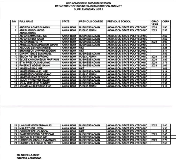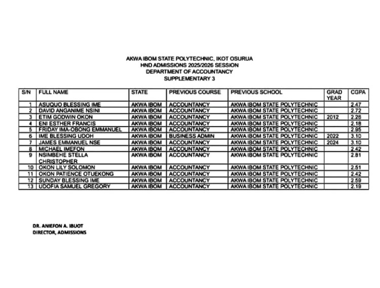 Akwa Ibom State Polytechnic, Ikot Osurua, has announced the release of the third supplementary admission list for candidates who participated in the 2025/2026 Higher National Diploma (HND) screening exercise.