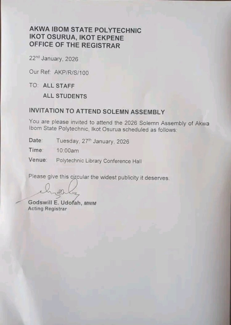 The Office of the Registrar, Akwa Ibom State Polytechnic, Ikot Osurua, has invited all staff and students to attend the 2026 Solemn Assembly of the institution.