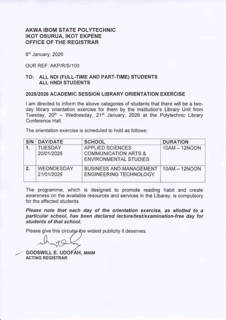 Akwa Ibom State Polytechnic, Ikot Osurua, Ikot Ekpene, has announced a two-day library orientation exercise for all National Diploma I (NDI) and Higher National Diploma I (HNDI) students for the 2025/2026 academic session.