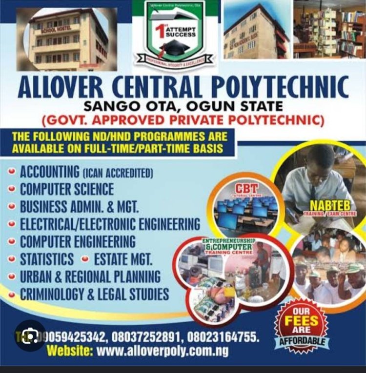 Allover Central Polytechnic, a government-approved private institution in Sango-Ota, Ogun State, has announced admissions for its ND and HND programmes on a full-time and part-time basis. Available courses include Accounting (ICAN Accredited), Computer Science, Business Administration, Engineering, Criminology, and more.