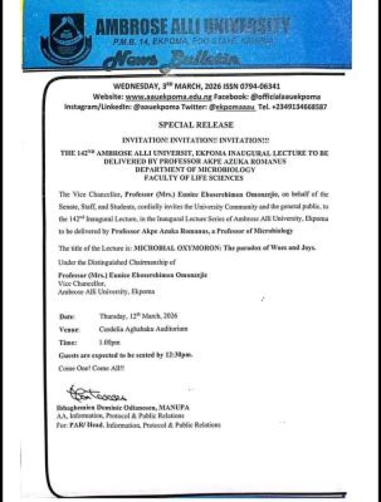 Ambrose Alli University (AAU), Ekpoma Announces 142nd Inaugural Lecture