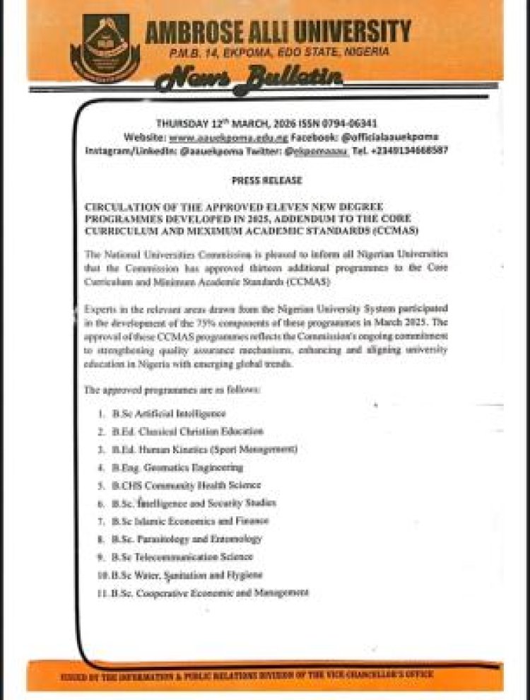 The National Universities Commission (NUC) has officially approved thirteen additional programmes for inclusion in the Core Curriculum and Minimum Academic Standards (CCMAS) at Ambrose Alli University (AAU).