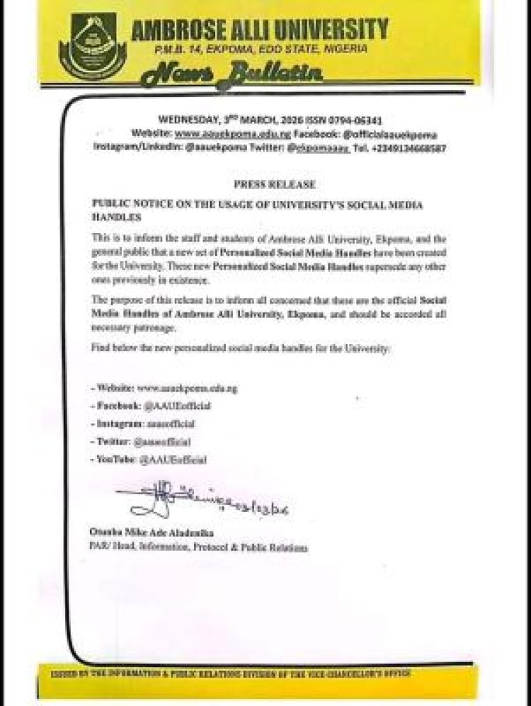 Ambrose Alli University, Ekpoma (AAU), wishes to inform staff, students, and the general public that new personalized social media handles have been created for the University.