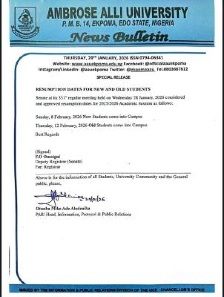 The Senate of Ambrose Alli University (AAU), at its 331st regular meeting held on Wednesday, 28th January 2026, has approved the resumption dates for the 2025/2026 academic session.