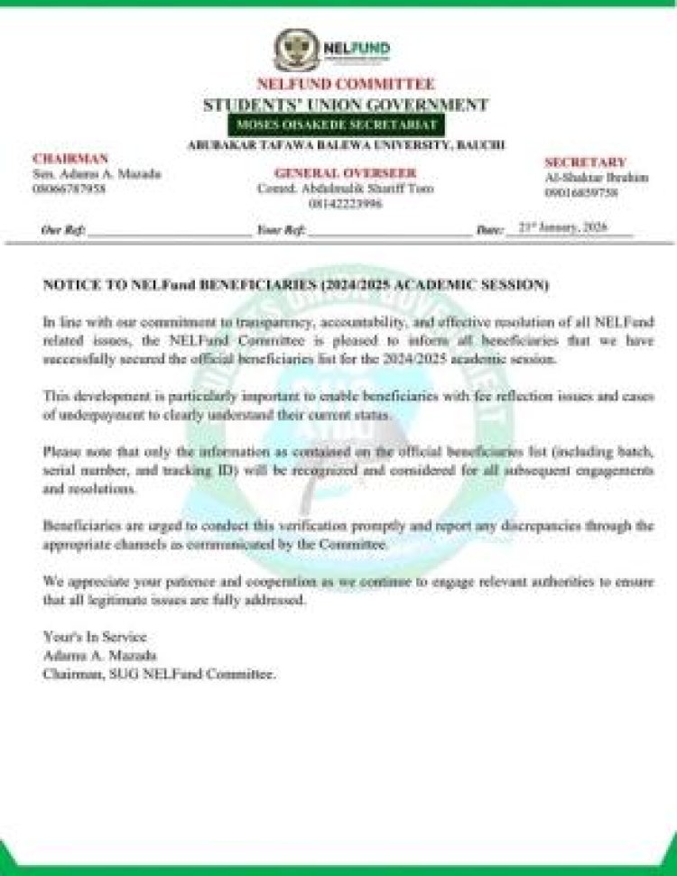 The notice was signed by Sen. Adamu A. Mazadu, Chairman, SUG NELFund Committee, ATBU, Bauchi.