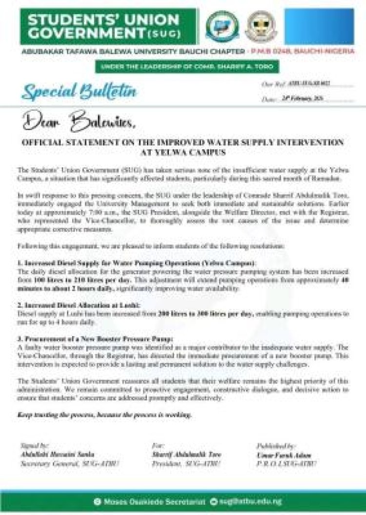 The Students’ Union Government (SUG) of Abubakar Tafawa Balewa University (ATBU), Bauchi, has successfully addressed the persistent water shortage on the Yelwa Campus, providing much-needed relief to students ahead of the holy month of Ramadan.
