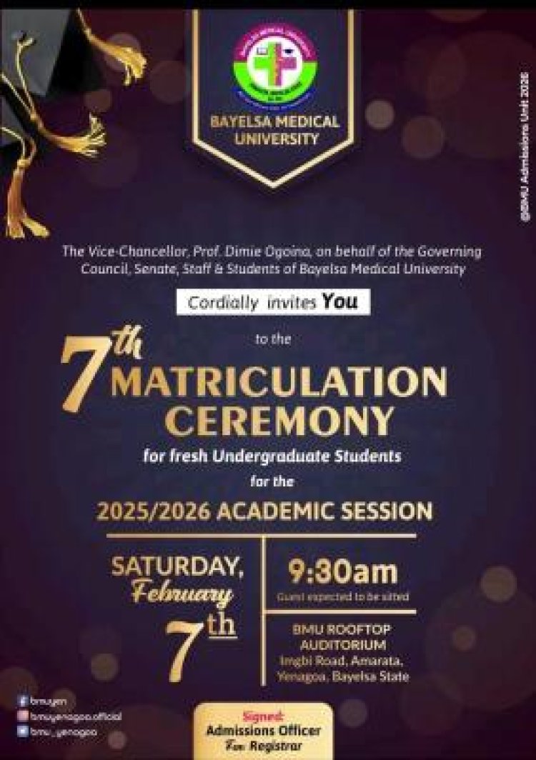 The management of Bayelsa Medical University (BMU) has announced its 7th Matriculation Ceremony, set to formally welcome the newest cohort of undergraduate students for the 2025/2026 academic session.