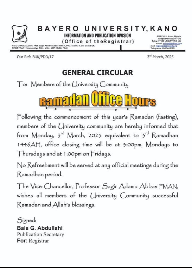 Bayero University Kano (BUK) has announced adjustments to its official working hours for the duration of the holy month of Ramadan. According to a general circular issued on March 3, 2025, by the Registrar’s office, the new working hours will take effect from Monday, 3rd March 2025, corresponding to 3rd Ramadan 1446AH.