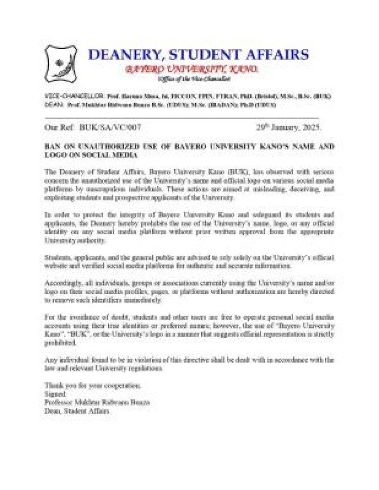 The Management of Bayero University, Kano (BUK), through the Deanery of Student Affairs, has issued a strict directive prohibiting the unauthorized use of the University’s name, acronym, or logo on all social media platforms.
