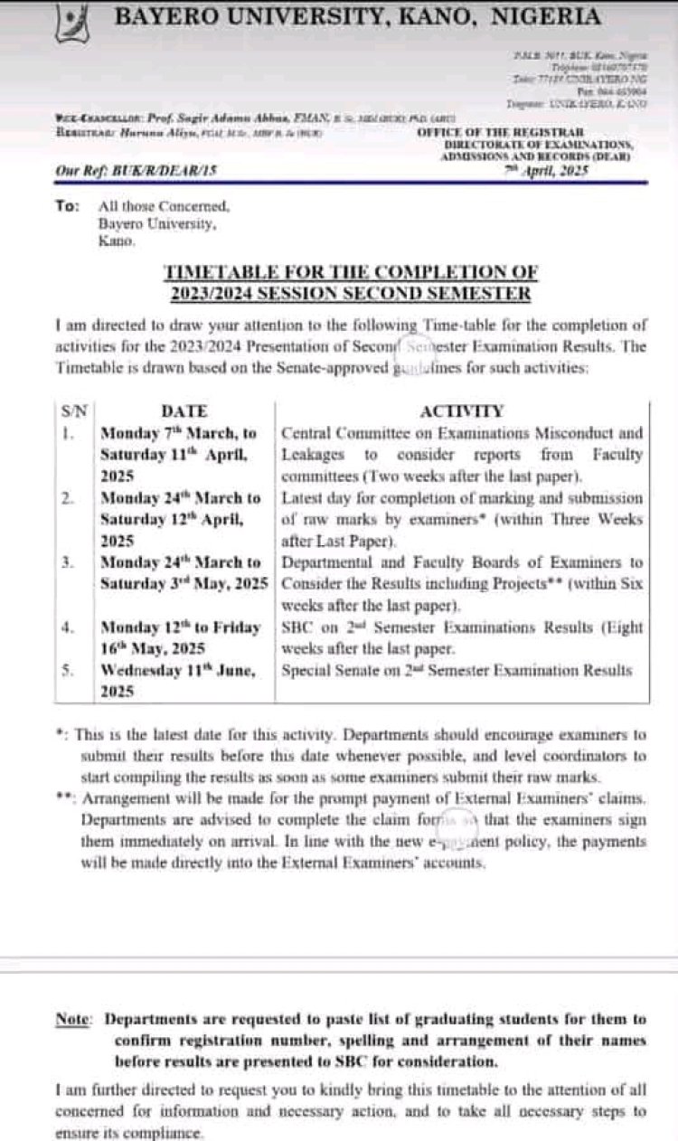 The management of Bayero University Kano has released a timetable for the completion of activities related to the 2023/2024 second semester examination results.