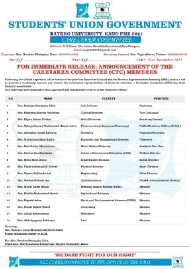 Bayero University, Kano Students’ Union Announces Caretaker Committee to Manage Student Affairs