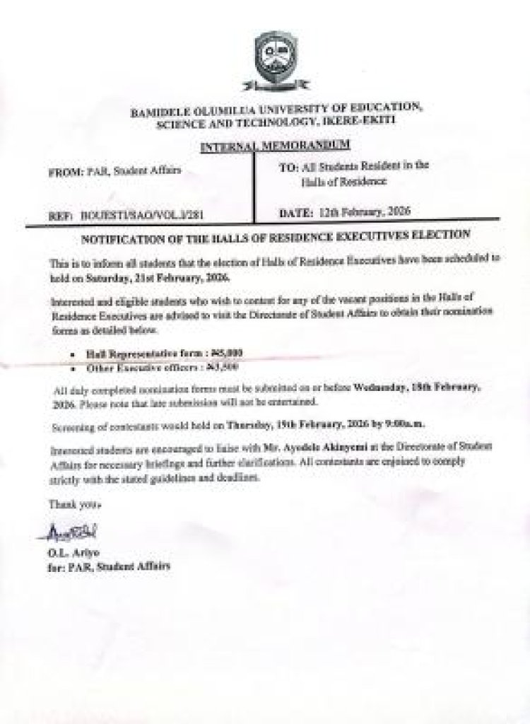 The management of Bamidele Olumilua University of Education, Science and Technology (BOUESTI) has announced the schedule for the election of Hall of Residence executives, with the exercise set to hold on Saturday, February 21, 2026.
