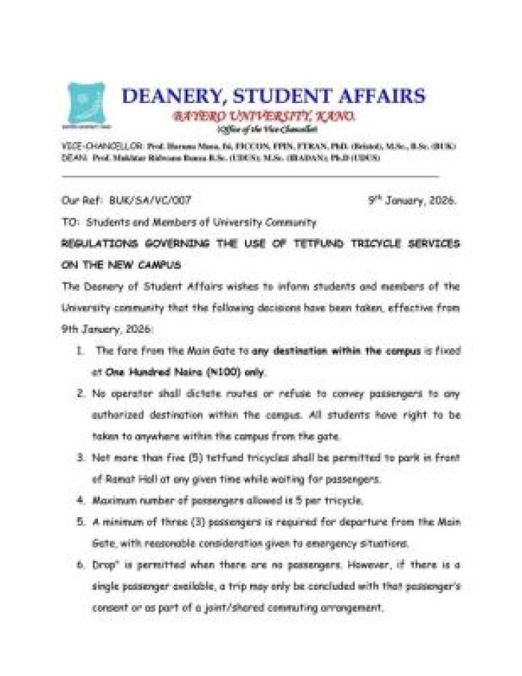 The Deanery of Student Affairs at Bayero University Kano (BUK) has released new rules governing tricycle (Keke) operations on the New Campus, effective from 9th January 2026.