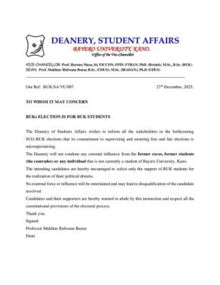 The Deanery of Student Affairs at Bayero University, Kano (BUK), has issued a firm warning against any form of external interference in the forthcoming Students’ Union Government (SUG) elections, reaffirming the university’s resolve to conduct a credible and student-driven electoral process.