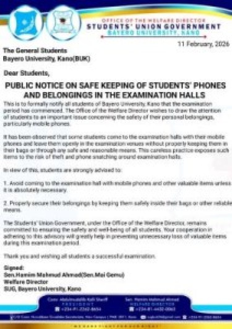 In a statement dated 11th February 2026, the Welfare Director, Sen. Hamim Mahmud Ahmad (Sen. Mai Gemu), highlighted concerns about careless handling of personal items within exam halls. The notice noted that some students have been bringing phones into examination venues and leaving them unattended, increasing the risk of theft or snatching.