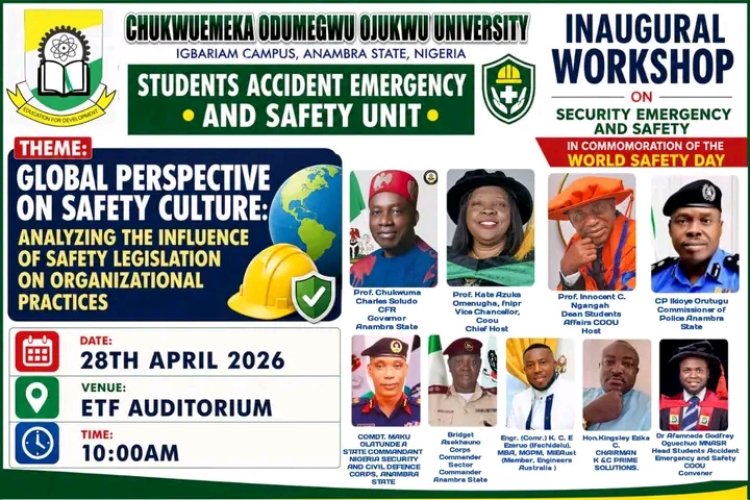 Chukwuemeka Odumegwu Ojukwu University COOU is set to host an inaugural workshop on security accident emergency and safety as part of activities marking World Safety Day