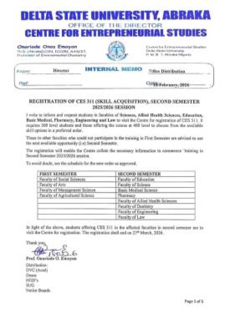 Delta State University, Abraka (DELSU) has directed students in select faculties to register for the compulsory skill acquisition course, CES 311 (Skill Acquisition), for the second semester of the 2025/2026 academic session.