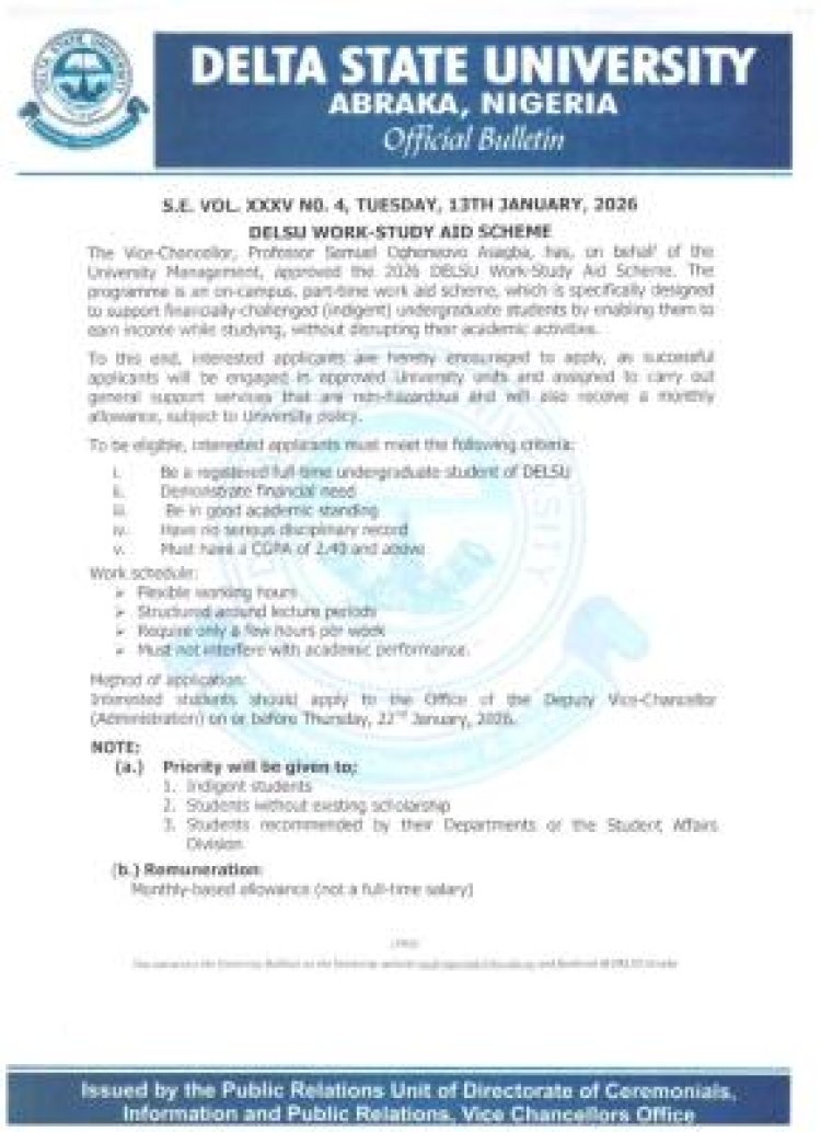The Management of Delta State University (DELSU), Abraka, under the leadership of the Vice-Chancellor, Professor Samuel Ogheneovo Asagba, has approved the implementation of the 2026 Work-Study Aid Scheme aimed at supporting indigent undergraduate students.