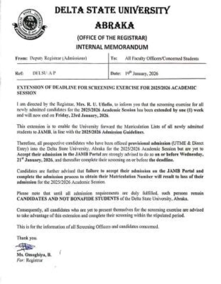 The Delta State University (DELSU), Abraka, has announced a one-week extension for the physical screening exercise of all newly admitted candidates for the 2025/2026 Academic Session.