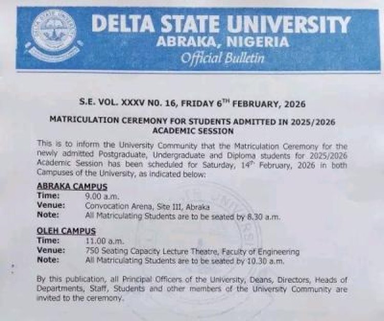 The management of Delta State University (DELSU) has announced that the Matriculation Ceremony for newly admitted Postgraduate, Undergraduate, and Diploma students for the 2025/2026 academic session will hold on Saturday, 14th February 2026 across both campuses.