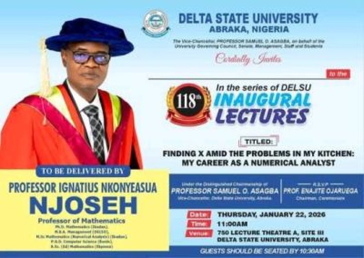 According to an official notice from the University, the lecture will be delivered by Professor Ignatius Nkonyeasua Njoseh, a Professor of Mathematics at Delta State University. The inaugural lecture is titled “Finding X Amid the Problems in My Kitchen: My Career as a Numerical Analyst.”