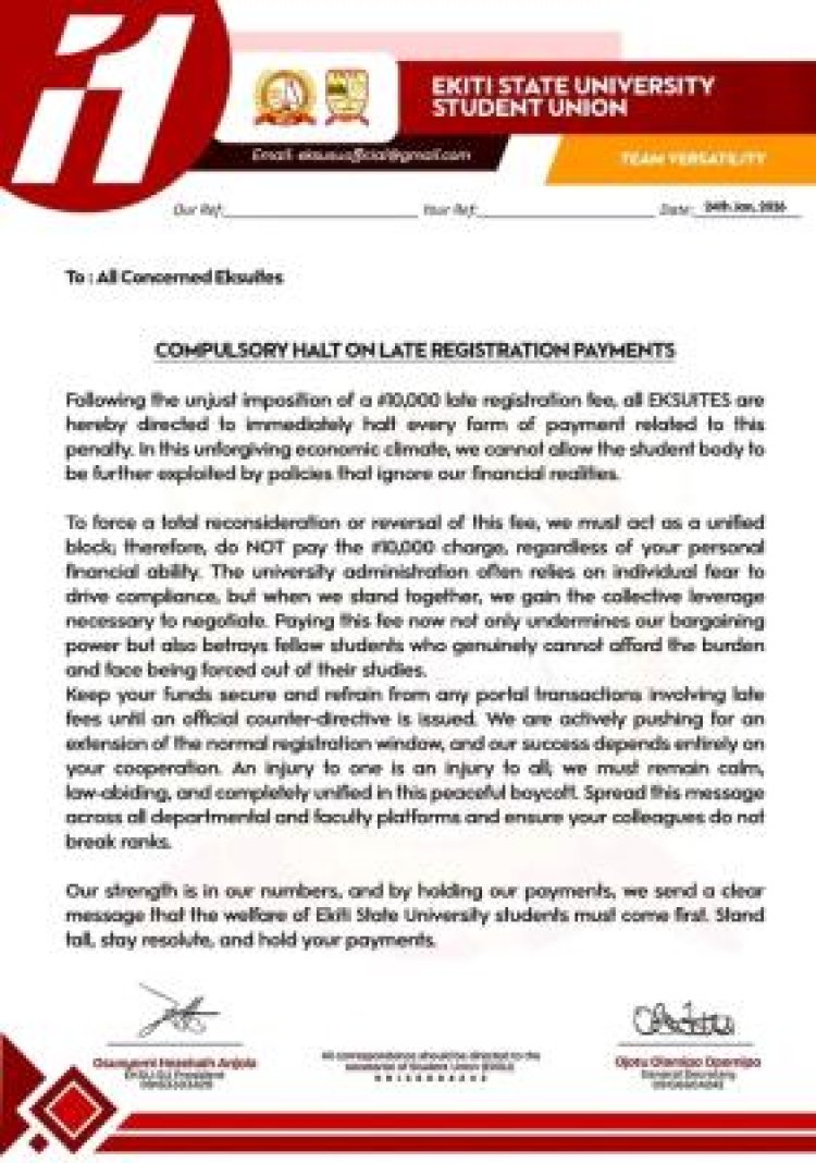 The Ekiti State University Student Union (EKSU SU), led by "Team Versatility," has directed all students to immediately stop payment of the newly imposed ₦10,000 late registration fee, describing it as an “unjust imposition” and exploitative in light of current economic challenges.