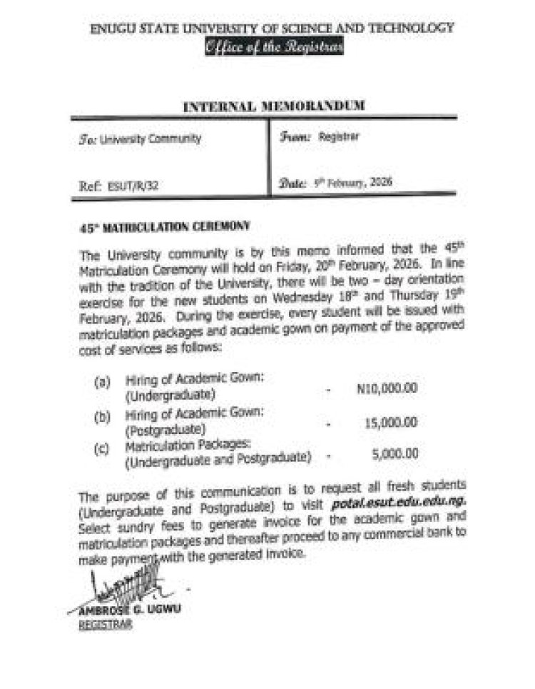 The University community is hereby informed that the 45th Matriculation Ceremony of Enugu State University of Science and Technology (ESUT) is scheduled to hold on Friday, 20th February 2026.